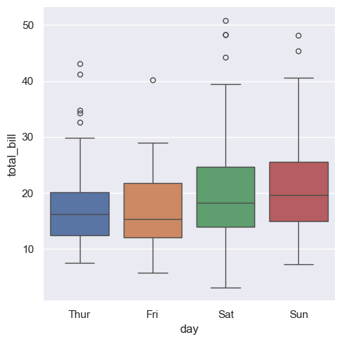 sns.catplot(x="day", y="total_bill", kind="box", data=tips, hue="day")